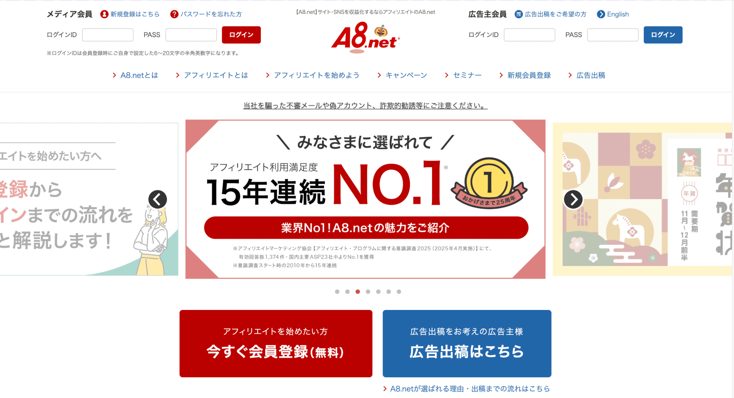 「A8.net(エーハチネット)」は、取り扱い案件も利用者も業界No.1の大手ASP会社です。
