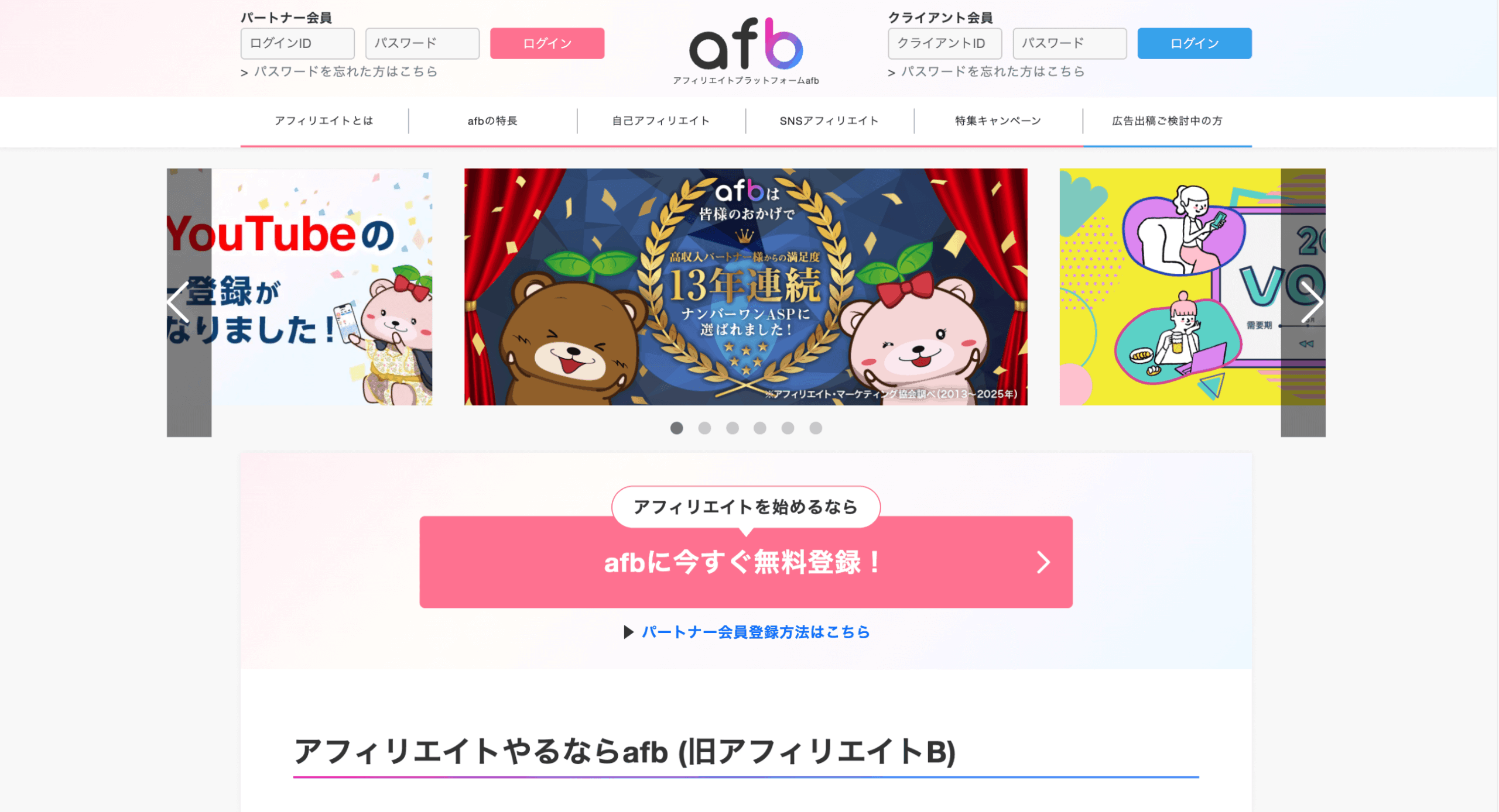 「afb(アフィビー)」は、InstagramやYouTubeなどでも広告掲載ができるASP会社です。
