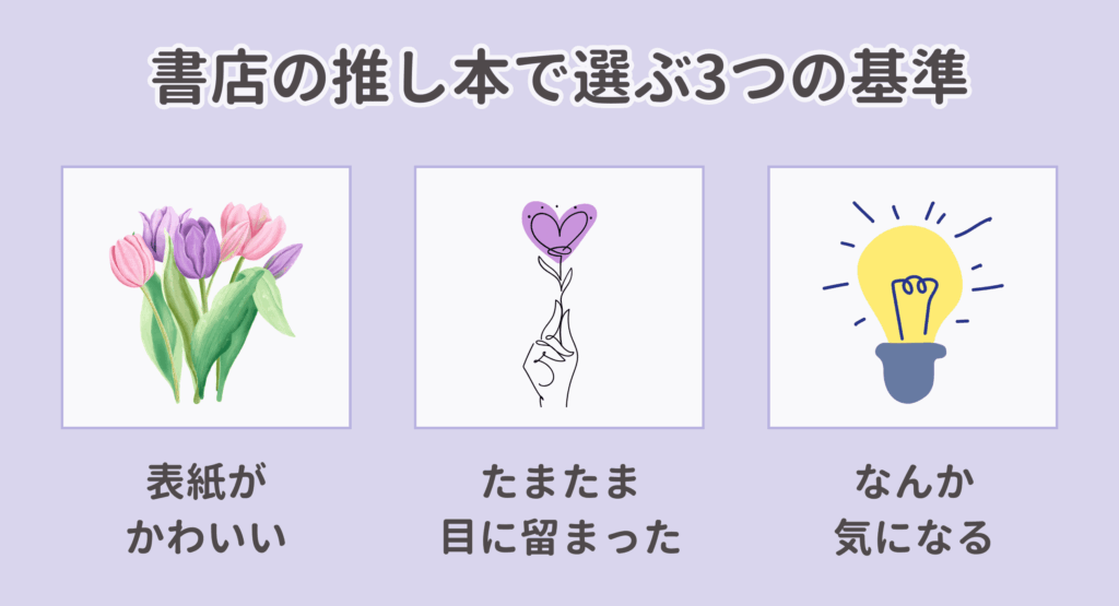 書店に行くと表紙が見えるように置かれている本があるので、いつもその中から選んでるよ!