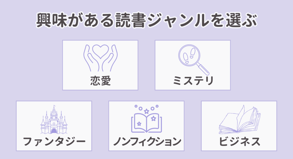ジャンルは消去法で絞ってみるのもおすすめ!わたしは、恋愛やノンフィクション系はほぼ読まないから、外す・・・みたいな感じかな!