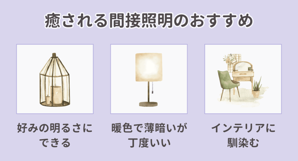 わたしが「癒される」と感じた間接照明のポイントは、以下の3つ。