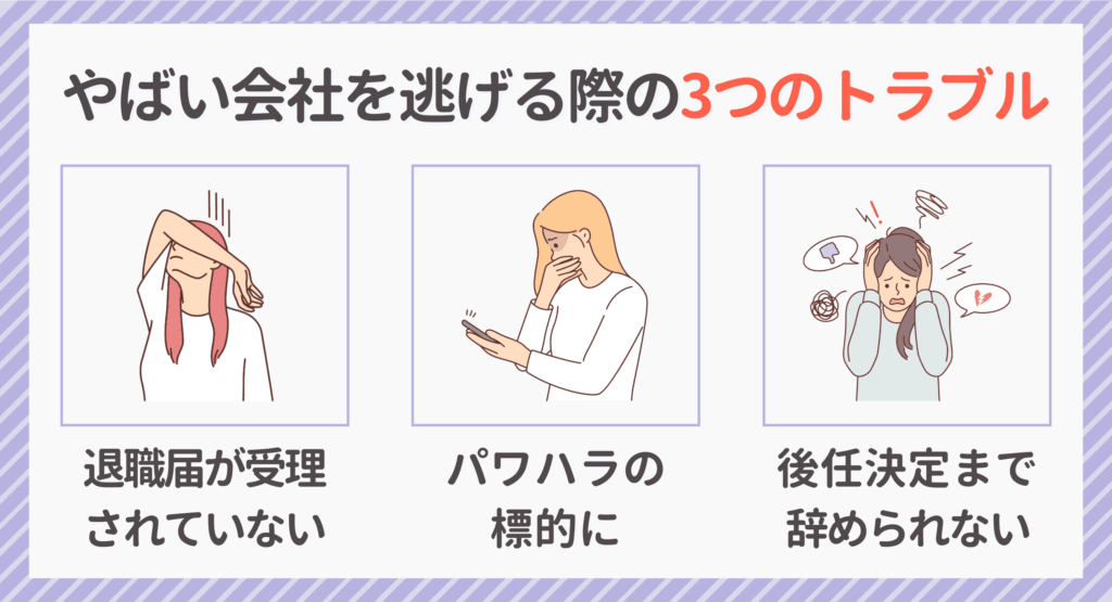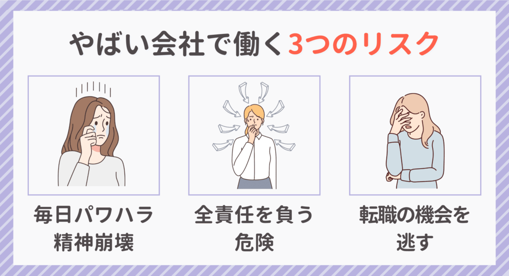 次の章で紹介する「やばい会社で働く3つのリスク」に一つでも当てはまったら、転職や退職を前向きに考えてみてくださいね。