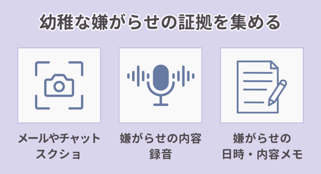 幼稚な嫌がらせをされた場合はあとから「言った・言ってない」問題になるので、証拠を集めておきましょう。